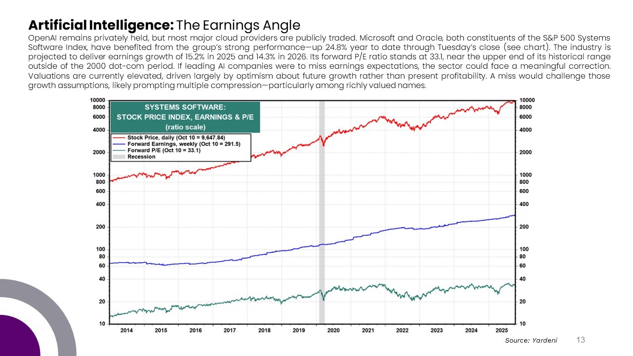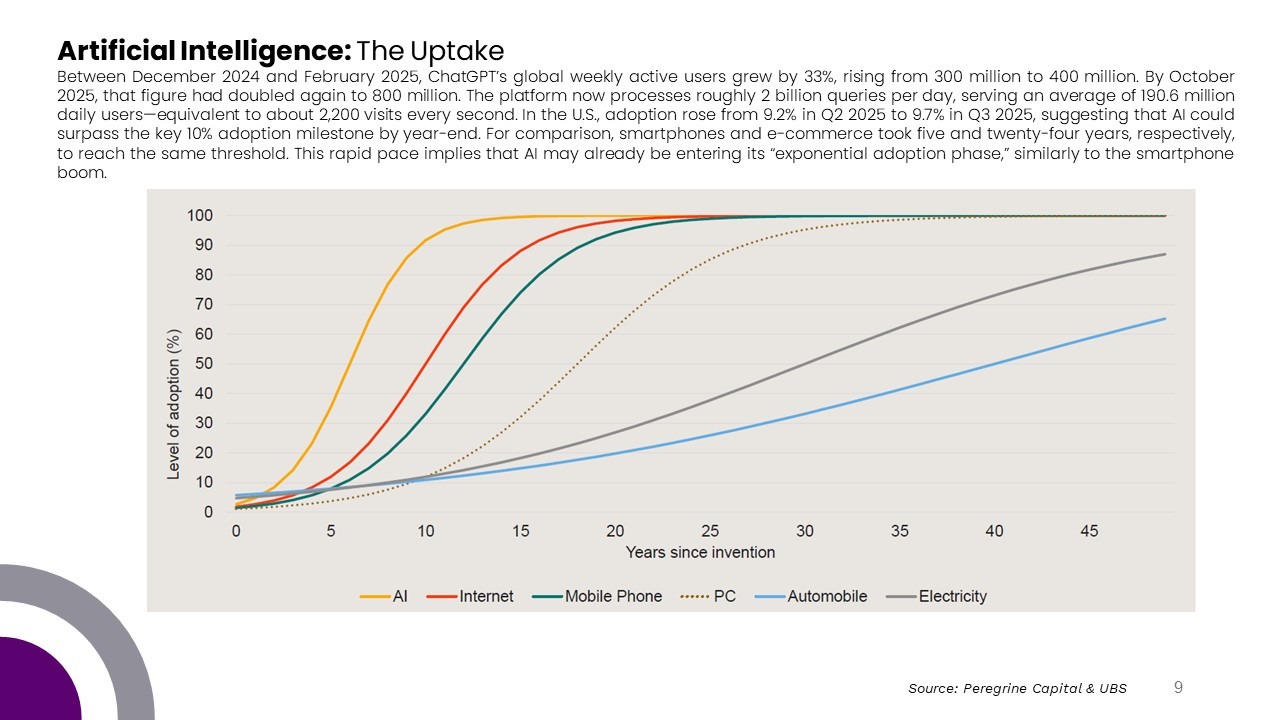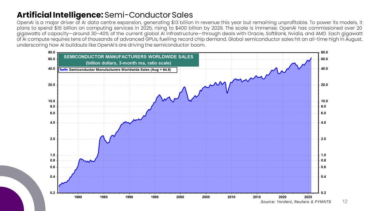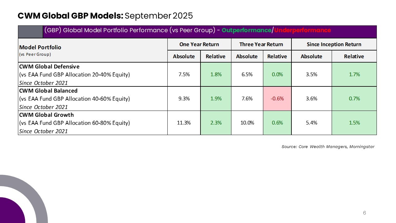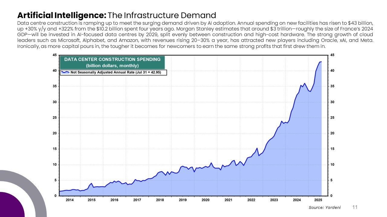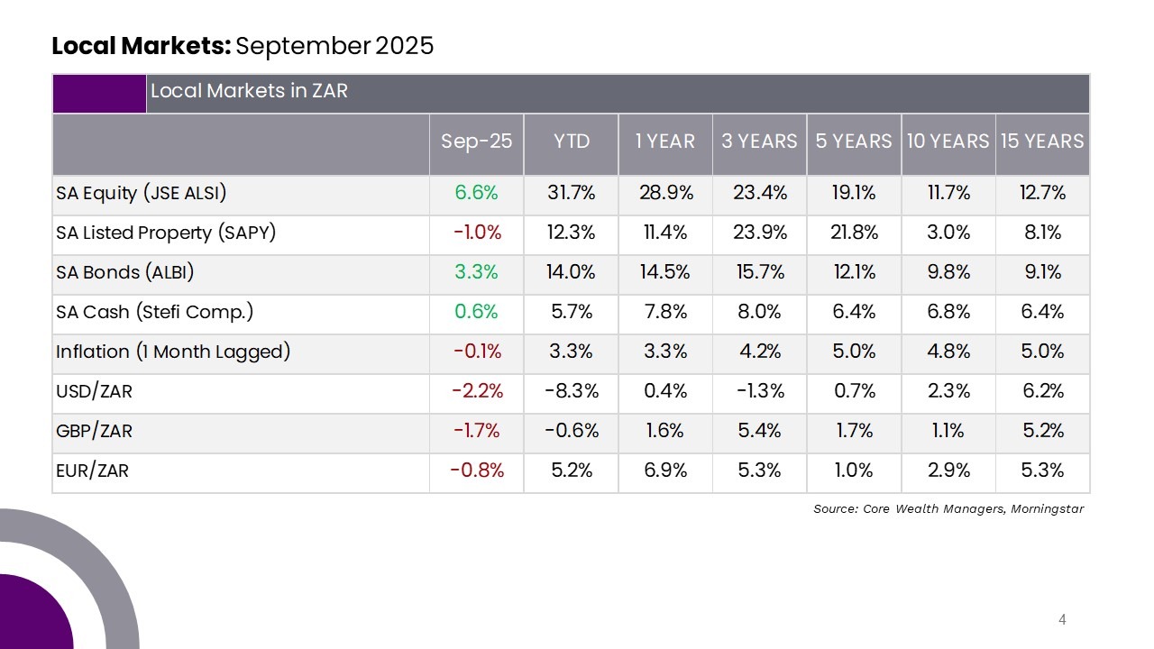 Global markets entered September with optimism and had a euphoric end to the month (despite the US Government shutdown), with developed markets enjoying a strong close to the quarter (MSCI World Index +3.2% MoM, +7.3% QoQ, +17.4% YTD) following the US FEDs first rate cut in a year. Big Tech once again led gains, with Nvidia’s partnership with OpenAI reigniting AI enthusiasm, highlighted by the performance of Tesla (+33% MoM), Alphabet (+14% MoM), Apple (+10% MoM), and Oracle (+24% MoM). Despite the S&P 500’s 15% YTD advance, returns remain concentrated, with sectors like Healthcare (+2.6% YTD), Consumer Staples (+3.9% YTD), and Consumer Discretionary (+5.3% YTD) lagging.